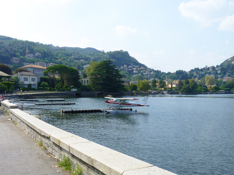 Direkt am See kommen wir an einer Werkstatt für Wasserflugzeuge vorbei, an der gerade eines der Fluggeräte am Starten ist. Es macht einen riesen Krach, aber auf uns auch einen großen Eindruck, als es sich nach einem längeren „Anlauf“ auf dem Wasser in die Lüfte über dem Comer See abhebt. Ansonsten sind wir jetzt nicht unbedingt „schwer“ beeindruckt. Wenn man vom Comer See hört, denkt man immer an noble Häuser, reiche Berühmtheiten und schicke Sportwagen. Die Stadt ansich ist nicht viel anders als andere italienische Städte gleicher Größe – große Kirche, enge Straßen, kleine Geschäfte…