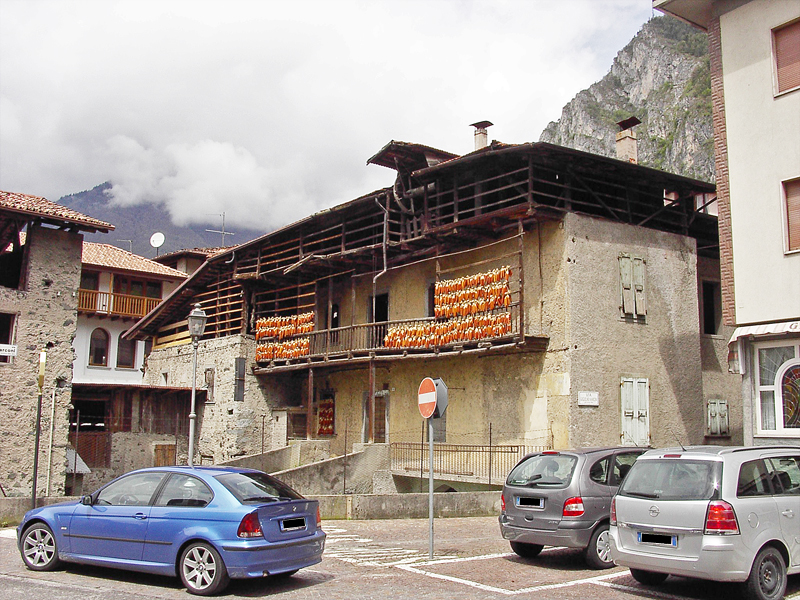 Der Aufenthalt am Ledrosee war kurz. Der Aufenthalt in Storo wird noch wesentlich kürzer sein. Hier gibt es eigentlich nichts zu sehen, außer ein altes Bauernhaus, an dessen Aussenwand Maiskolben aufgehangen sind. Was das bringen soll? Keine Ahnung sieht gut aus, macht im April aber irgendwie keinen Sinn. Die Maiskolben müssen ja vom Vorjahr sein.