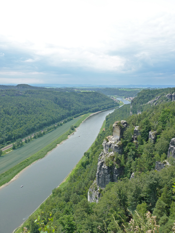 Auch auf Die Elbe, die ja dem Elbsandsteingebirge den Namen gab, kann man gut hinunter sehen. Der Fluß ist heir noch nicht wirklich ein „reissender Strom“, aber bis das Wasser die Nordesee erreicht, liegen auch noch ein paar Kilometer und einige Zuflüsse.